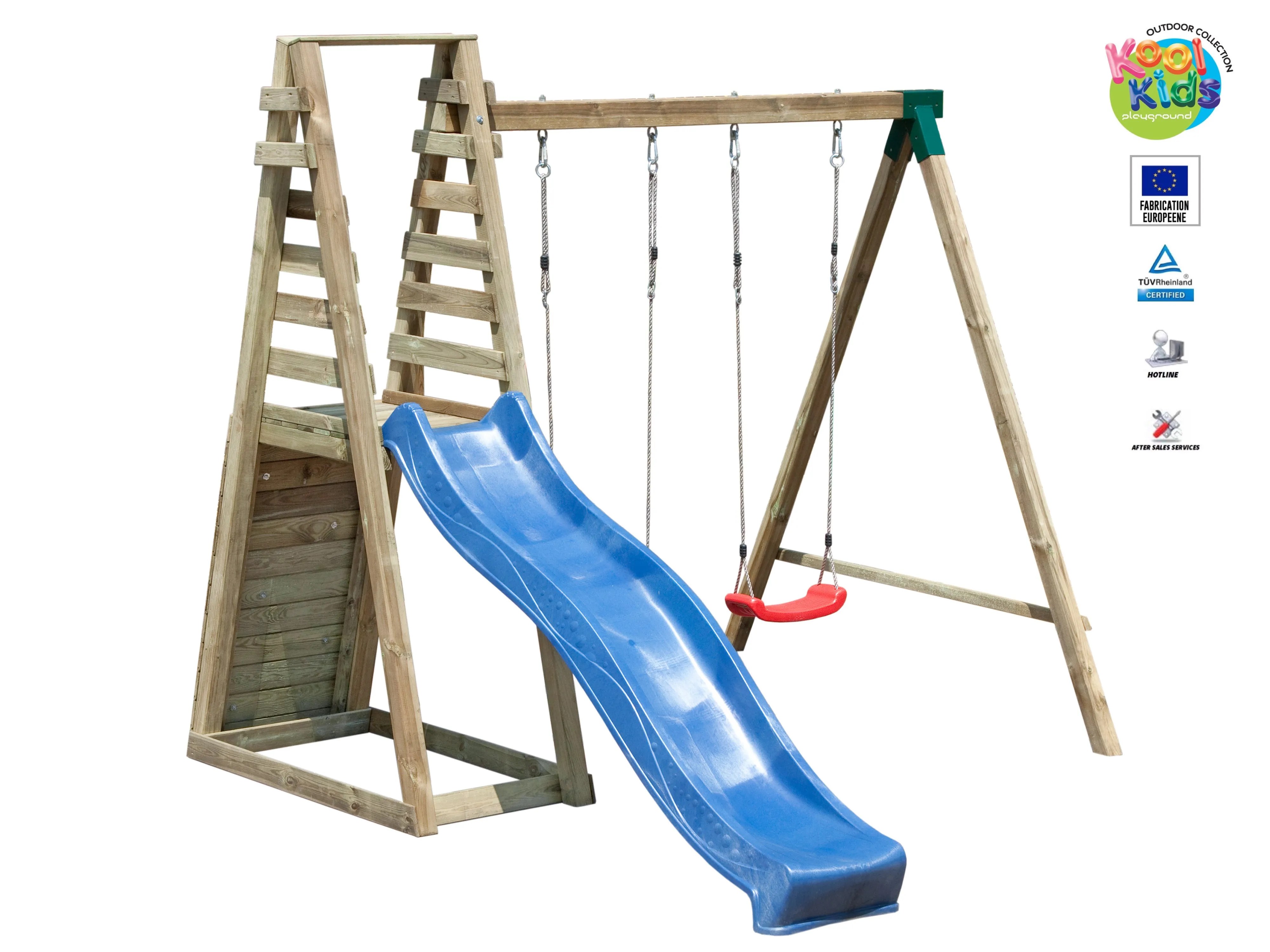 Balancoire en bois avec toboggan.