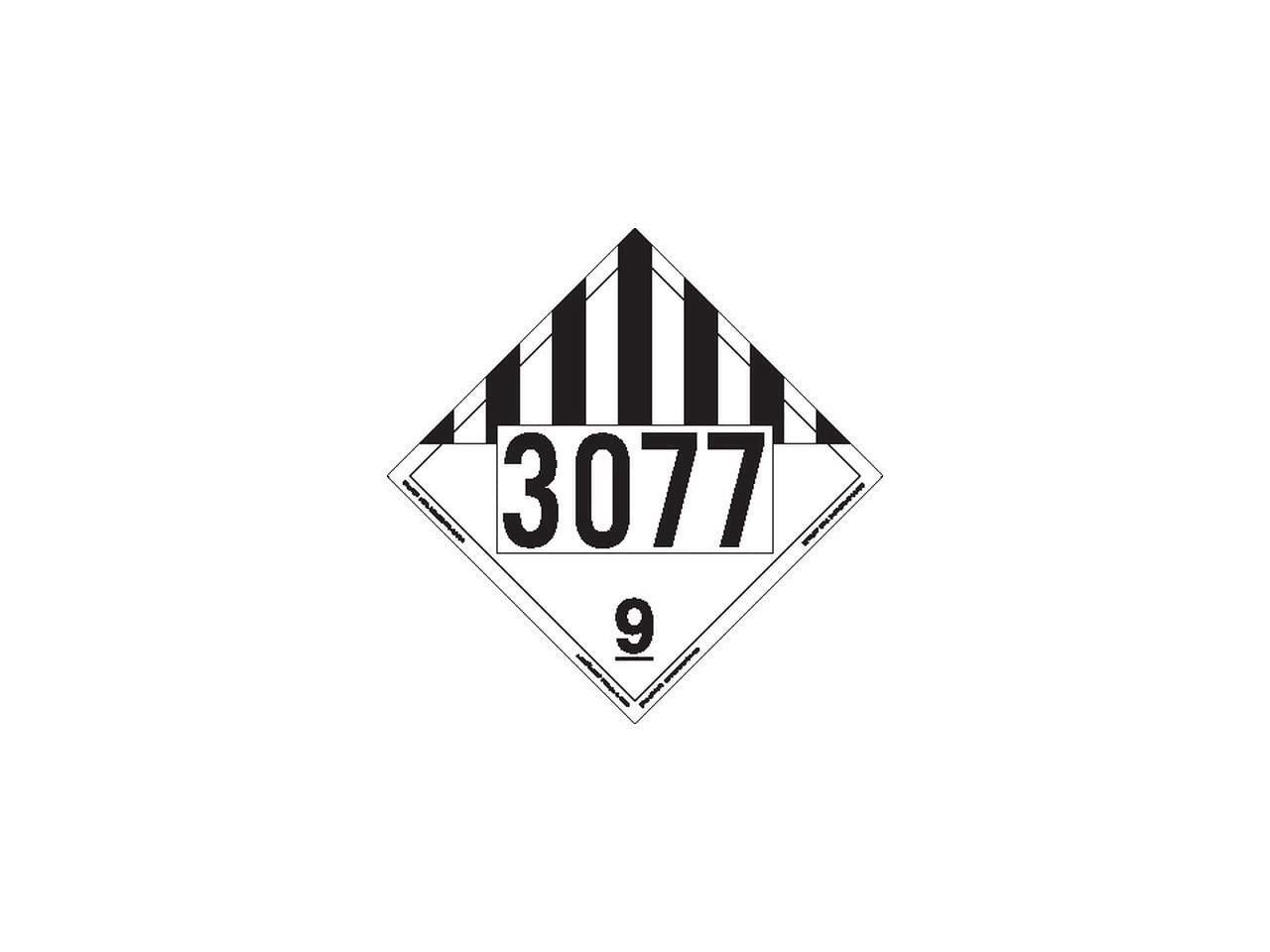 Dot placard 3077 environmental hazard, substances, solid, misc. It is used in paints for porcelain glass colors, fuel cell. Un 3077, 6 19/64 in label wd, 15 3/4 in label ht, removable vinyl item # 35zl98;